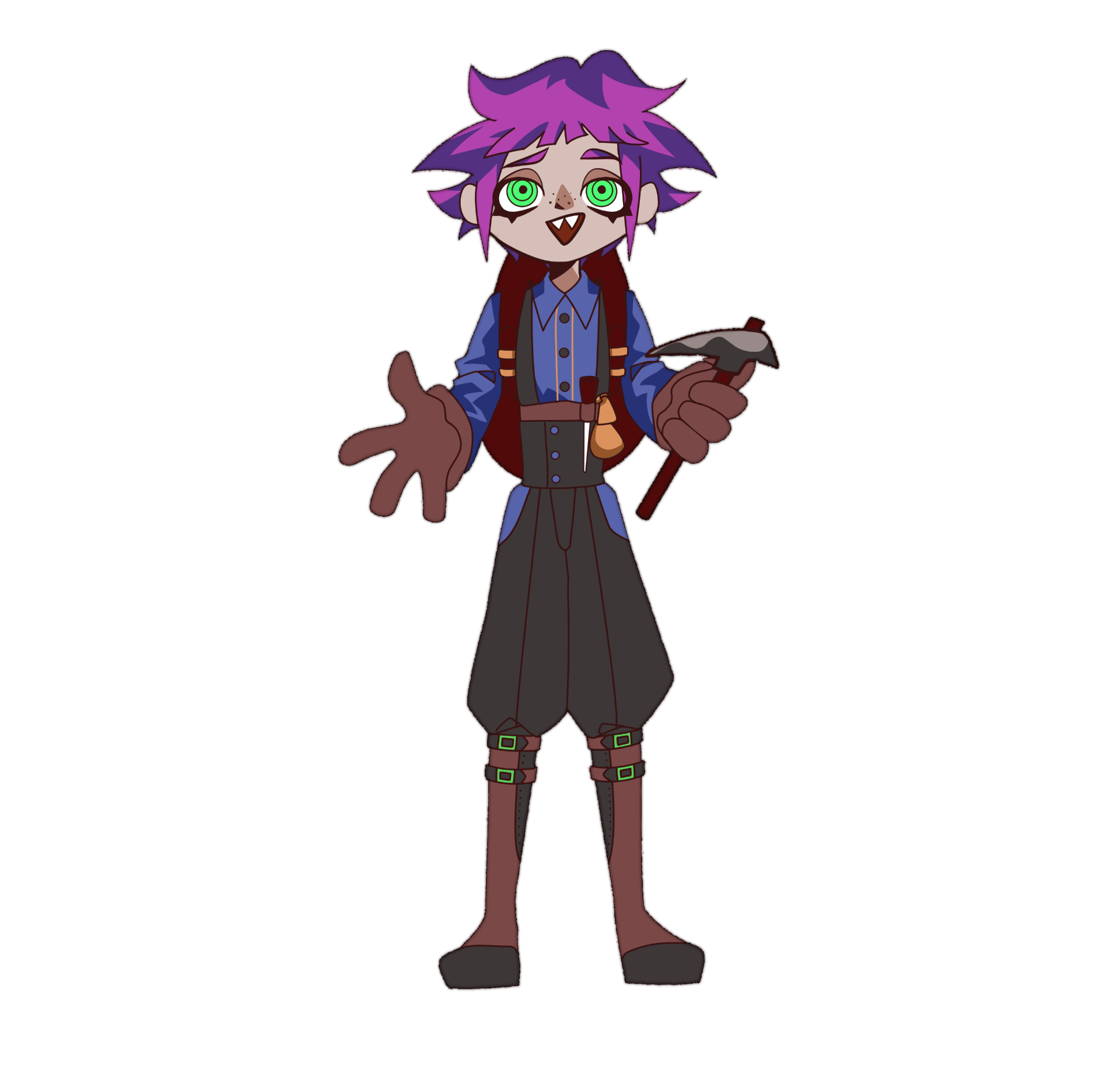 外觀:紫髮綠眸、鯊魚牙,黑藍色的穿搭和鳥頭面具。